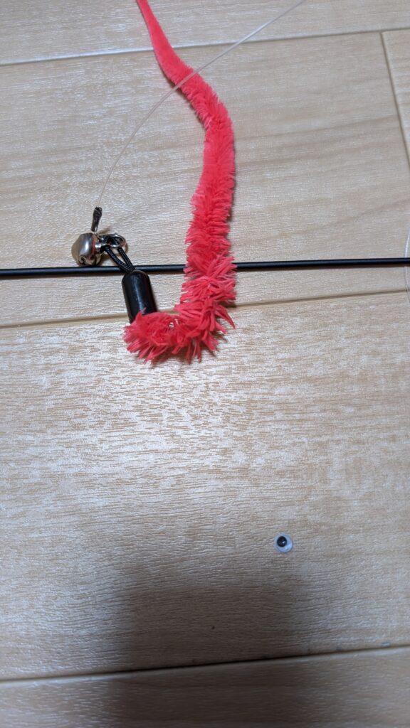 よく写真を見ると 右下に目のようなものがあります。 これは、赤い毛のおもちゃに…