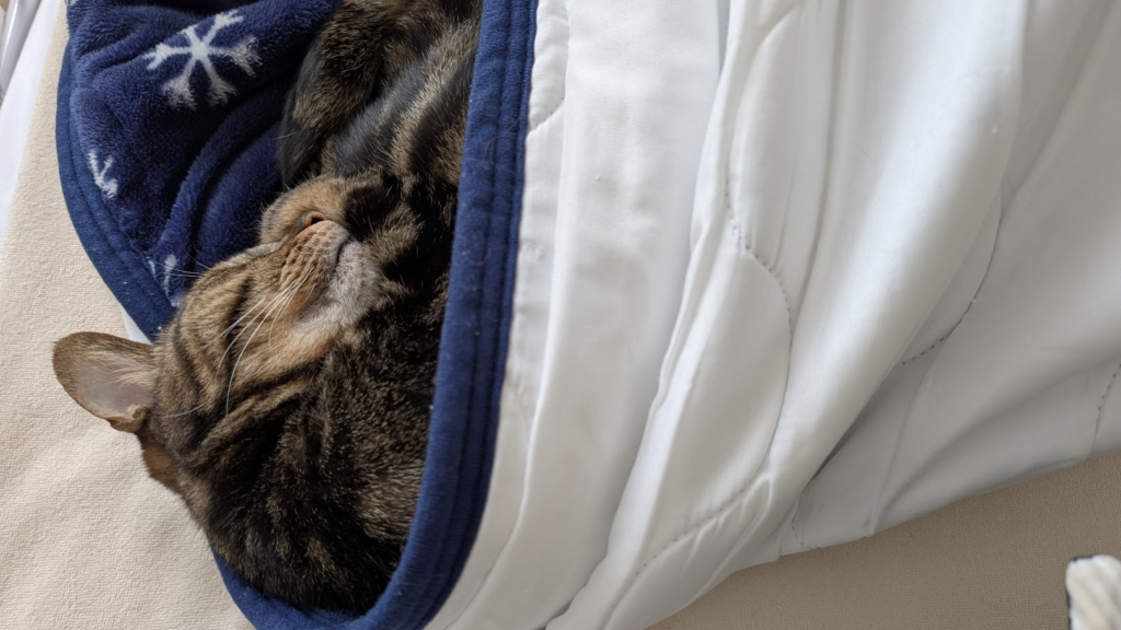 なぜそこ?! というところで猫様は寝ます。 飼い主がたたんだシーツの間に、ずい…