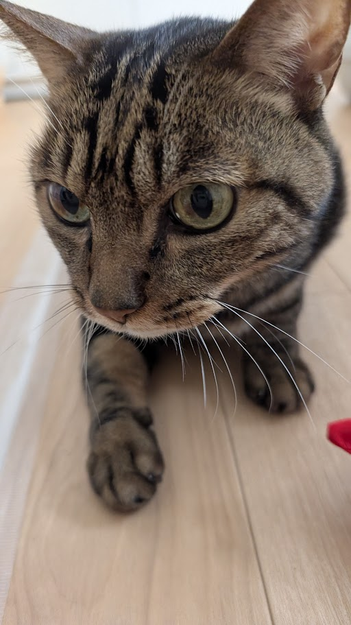 猫さん見守りカメラでの撮影。 とらにゃんは、おもちゃを自分で餌皿にいれてバクバ…